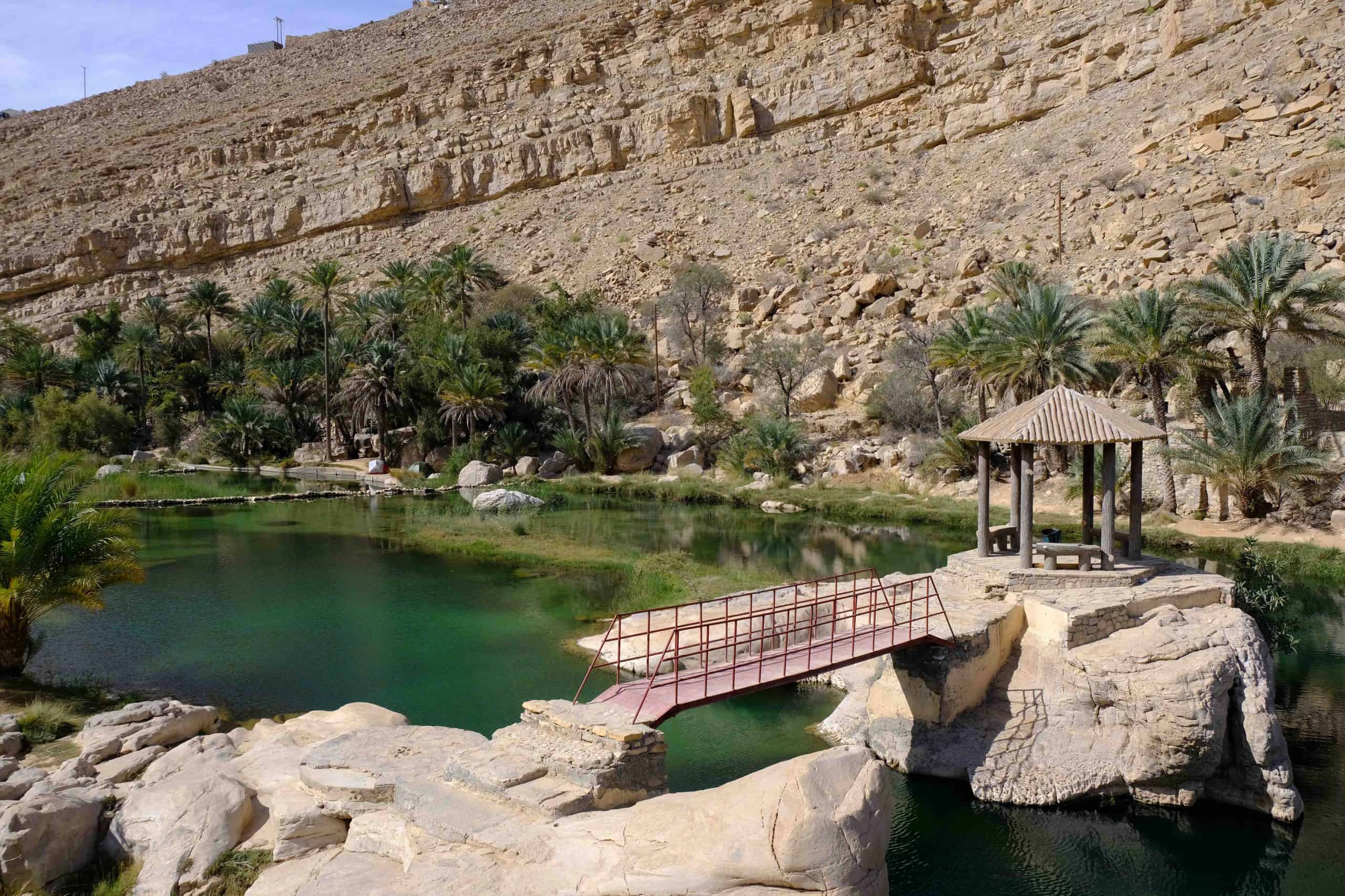 Arrive at the lush canyon of Wadi Bani Khalid. Take a short walk to the main pools for a dip in the emerald-green water. For the adventurous, a short hike leads to the "upper pools" and the entrance of the Muqal Cave.